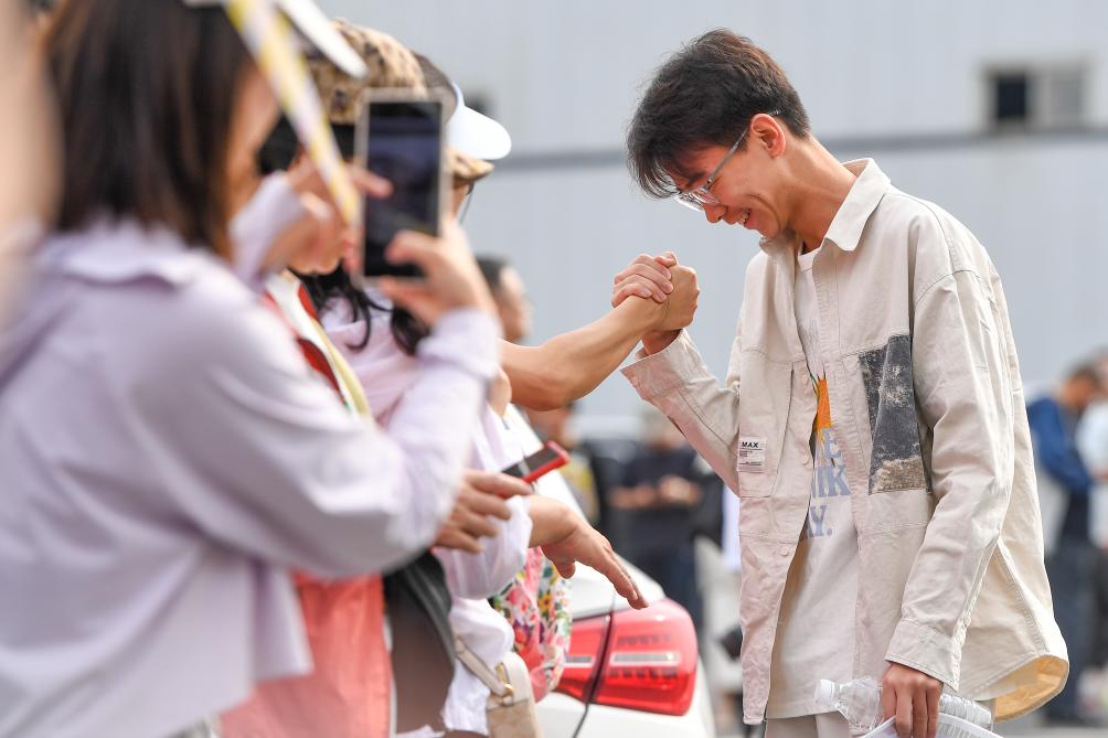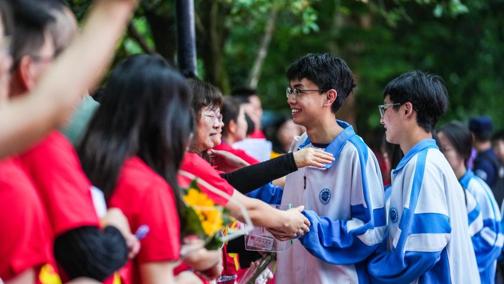 在位于吉林长春的吉林省实验中学考点,考生入场前与老师握手加油(2024年6月7日摄)。 新华社记者 张楠 摄