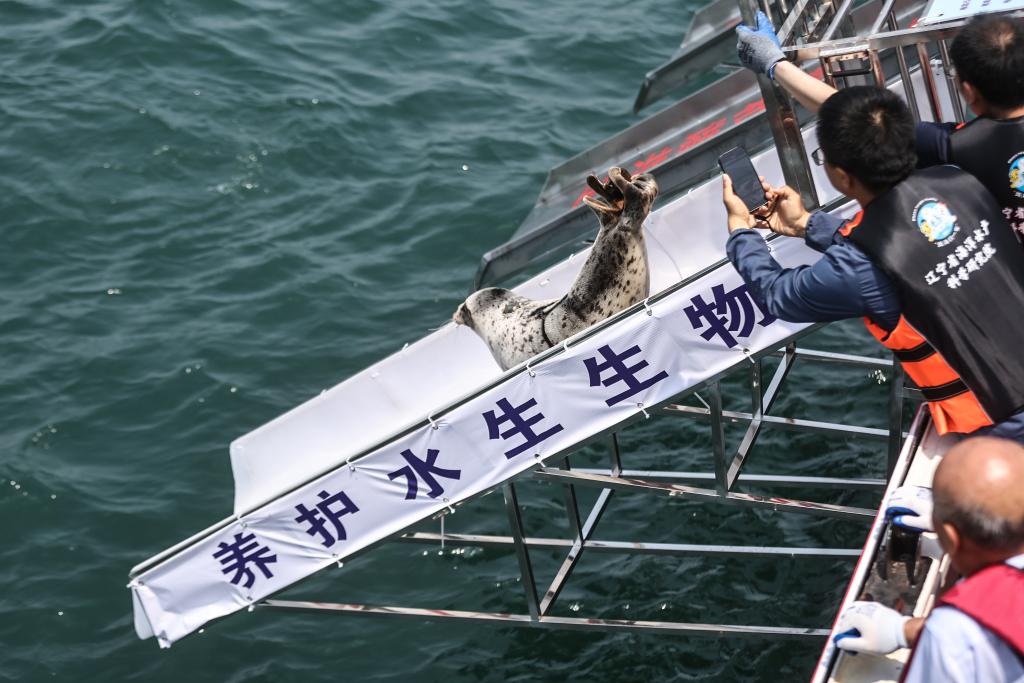 新华社大连6月6日电(记者高爽)6日11时许,西太平洋斑海豹“汤圆”顺着放归船上的滑梯滑下,进入辽宁省大连市三山岛附近海域。