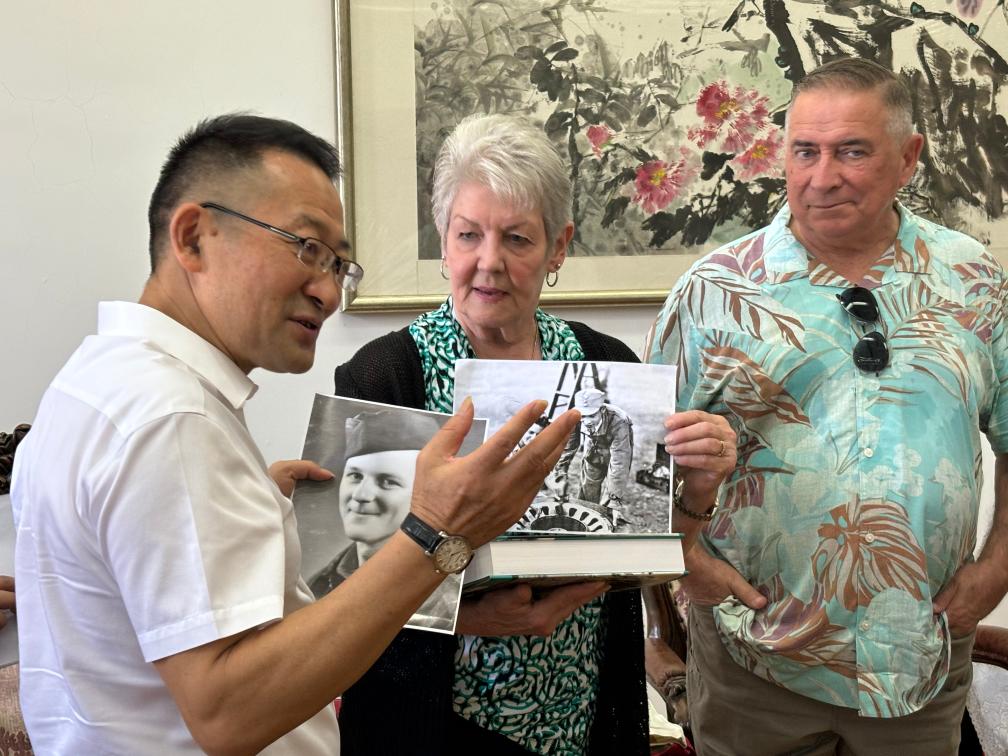 2024年9月8日,飞虎队老兵后人玛格丽特·金坎农(中)展示其捐赠给飞虎队纪念馆的照片。新华社记者 余春生 摄
