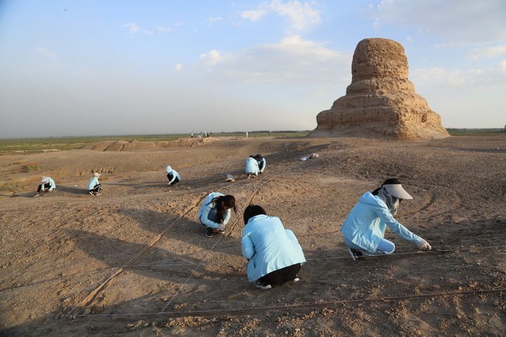 2019年7月,考古工作队员在新疆喀什莫尔寺遗址现场布置探方。新华社发(中央民族大学供图)