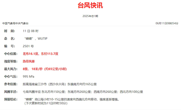 今天(6月11日)8时前后,南海热带低压增强为今年第1号台风“蝴蝶”(热带风暴级,英文名称:WUTIP;名字来源:中国澳门;名字意义:一种昆虫)。预计“蝴蝶”将于13日在海南岛南部到广东西部一带沿海登陆。