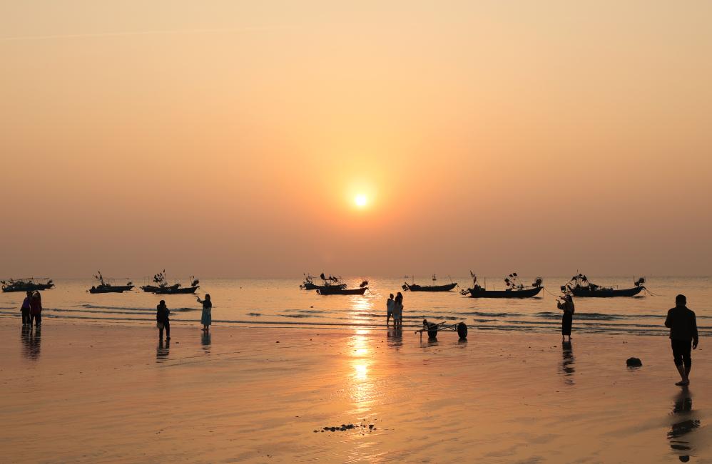 晨曦微露,海面波光粼粼。银白色的沙滩上,早起散步的人们留下一串串脚印。
