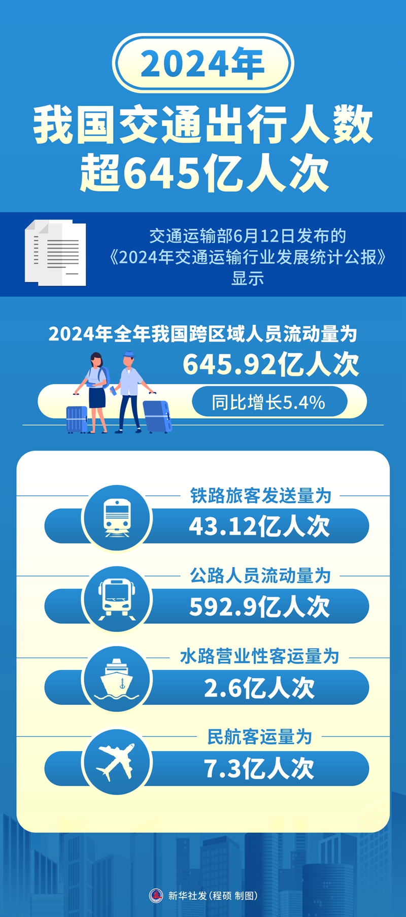 新华社北京6月12日电(记者叶昊鸣)交通运输部12日发布的《2024年交通运输行业发展统计公报》显示,2024年全年我国跨区域人员流动量为645.92亿人次,同比增长5.4%。
