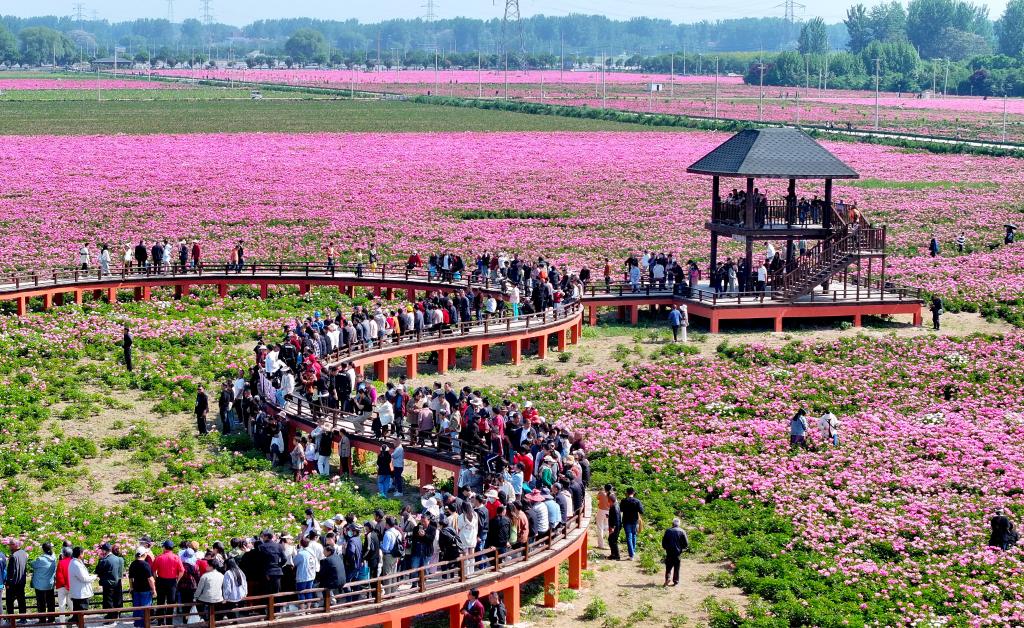 2025年5月1日,在亳州市谯城区十八里镇蒋李村,游客在芍药花海里赏花游玩。新华社发(刘勤利 摄)