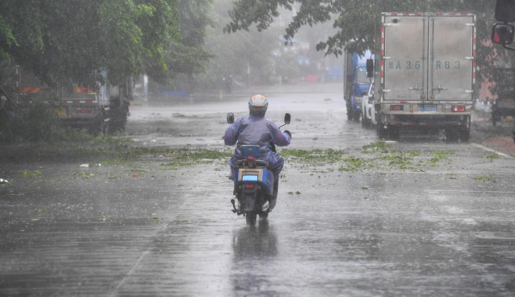 6月13日,在海南省乐东黎族自治县莺歌海镇,居民在台风中骑车出行。新华社记者 杨冠宇 摄