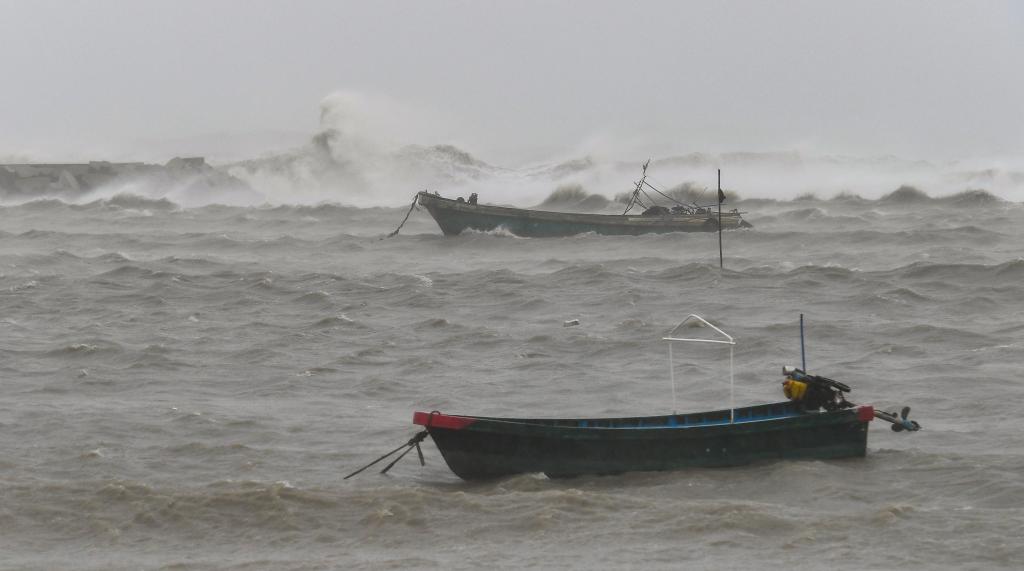 6月13日,渔船在海南省乐东黎族自治县莺歌海镇亲水广场附近海域停泊避风。新华社记者 杨冠宇 摄