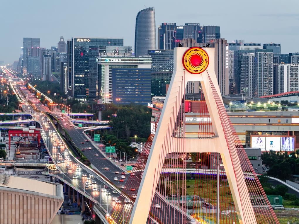 成都天府立交桥,其塔顶正中镶嵌着“太阳神鸟”徽记(资料照片)。 新华社发(金沙遗址博物馆供图)