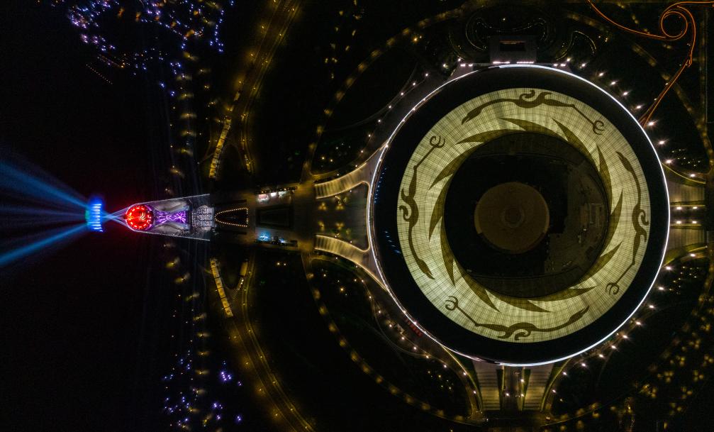 这是2023年4月19日拍摄的第31届世界大学生夏季运动会开幕式主体育场,主体育场的穹顶是由彩釉玻璃拼接而成的“太阳神鸟”(无人机照片)。 新华社记者 沈伯韩 摄