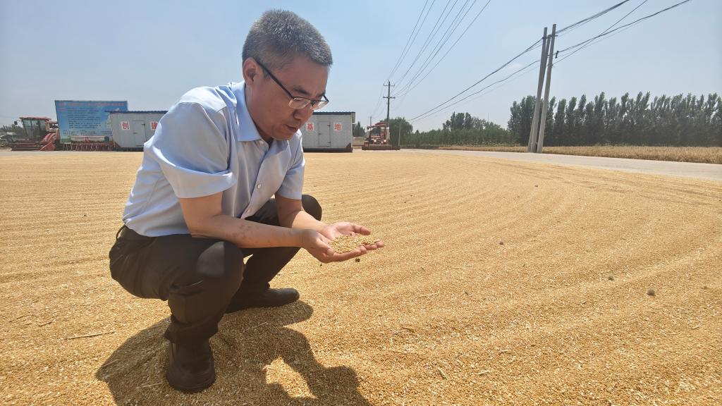 在德州禹城安仁镇齐庄村,尚信齐盛种植专业合作社理事长张树军正在查看晾晒的小麦。新华社记者萧海川 摄