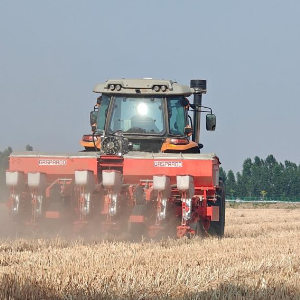 一季新麦刚刚收获,新的种子已经播下。在汶上县苑庄镇的农田里,一台大马力拖拉机正配合玉米精播机作业。铁犁碎开土块、刨出垄沟,玉米种子与肥料顺势播撒入土,种子的间距被精准控制在15厘米左右。