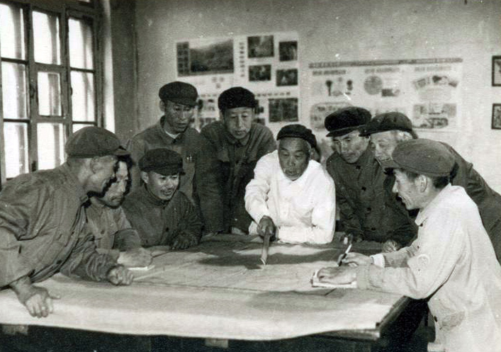 20世纪80年代,时任辽宁固沙造林研究所所长刘斌(中着白衣者)带领科技人员进行规划(资料照片)。新华社发