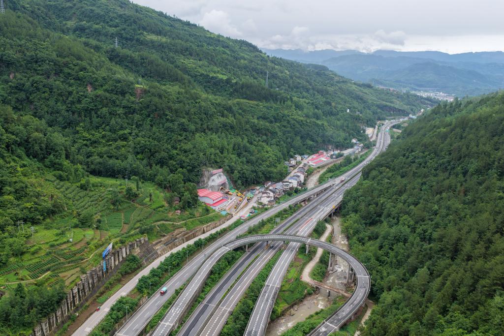 6月21日拍摄的宜涪高铁石柱隧道进洞施工现场(无人机照片)。新华社记者 唐奕 摄