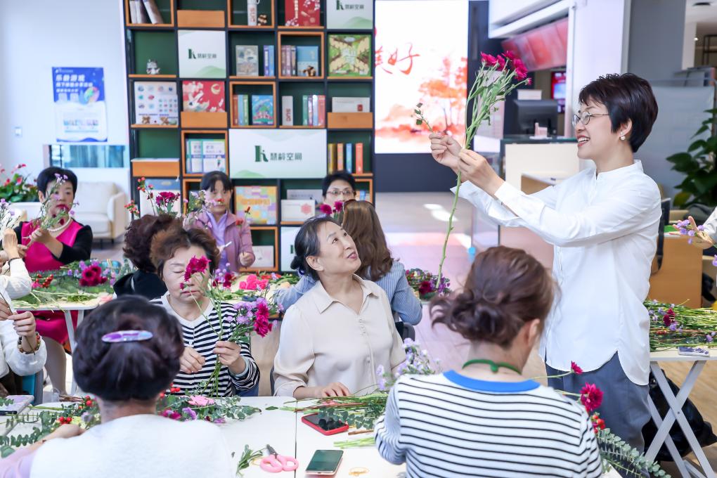 在国家老年大学魏公村校区课堂上,老师黄山正在讲授插花课程。(国家老年大学供图)