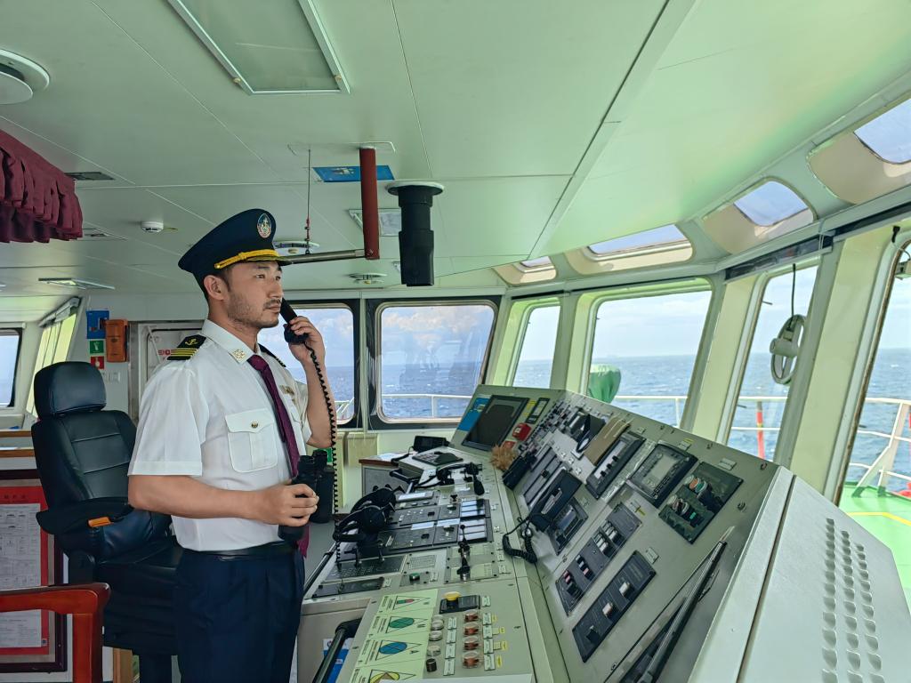海洋石油支持船船长宋承昊正在进行指挥,为中国南海“深海一号”能源站提供货物供给作业。(中海油田服务股份有限公司船舶事业部供图)
