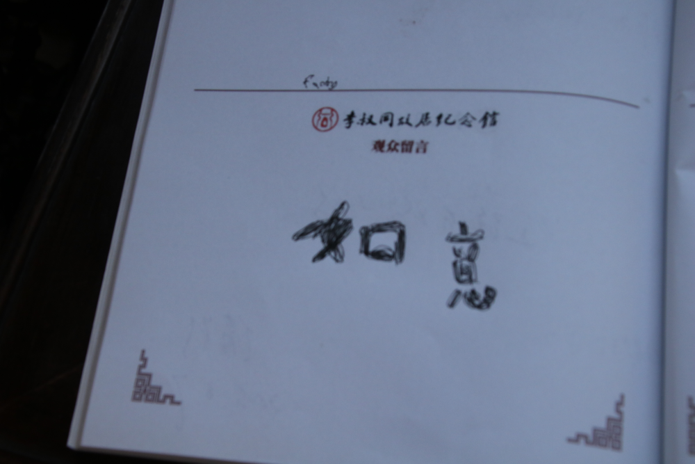 中书堂是靠近出口的最后一个展厅,一阵凉风拂过窗台,靠窗方桌上的留言簿随风翻页。过往游客的笔迹在我眼前闪过,字体有的稚嫩有的苍劲,有的整齐有的潦草,那是来自各地的人们对弘一法师的感悟,短则粗书两字“如意”,长则整页细叙一路走来的感想。