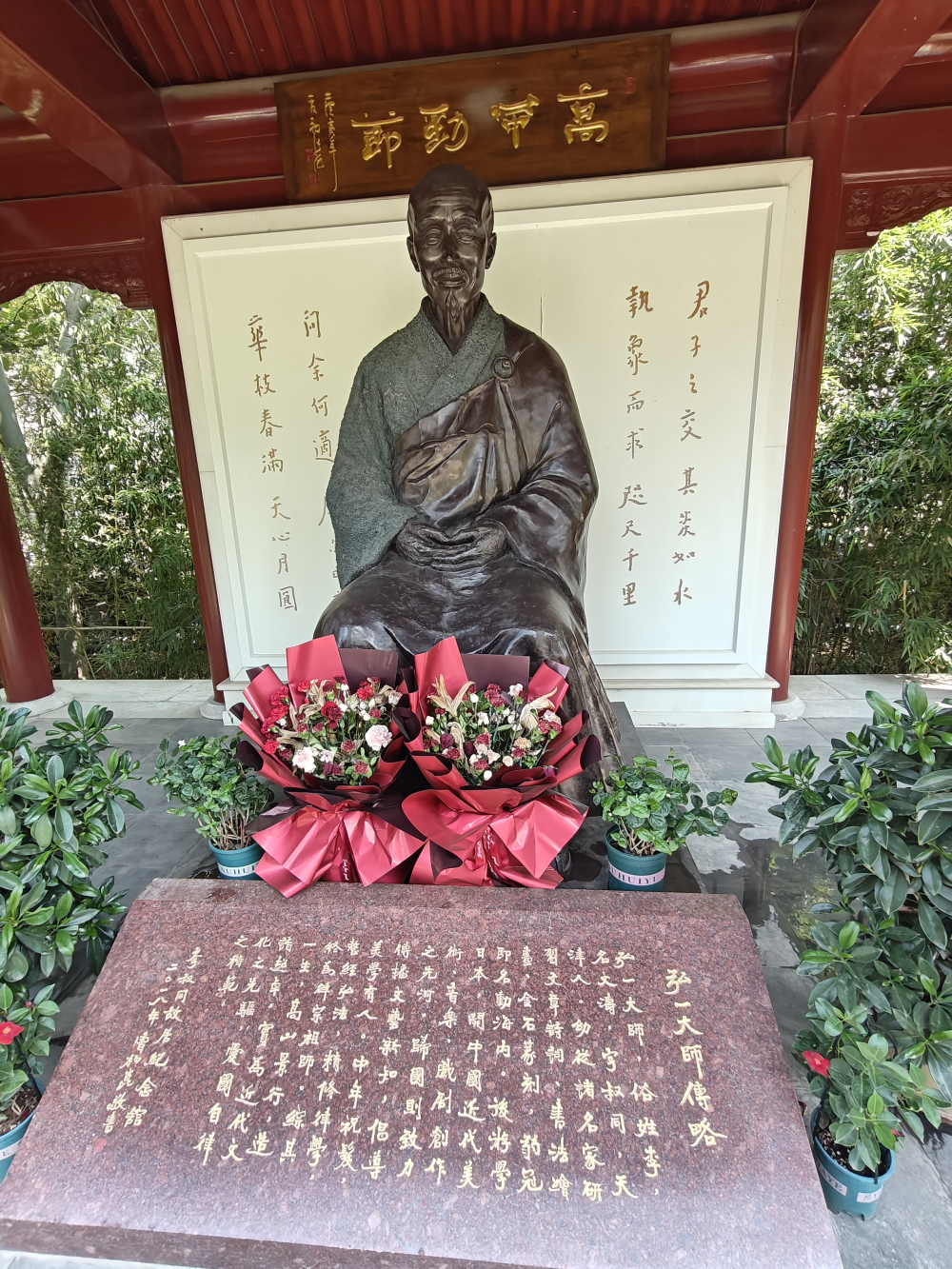 入门的花园中还有个铜像,剃度后的李叔同身着僧衣,眼神悲悯宁静,望着池塘、长亭,望着地上的鲜花,望着两旁的字碑,望着我。