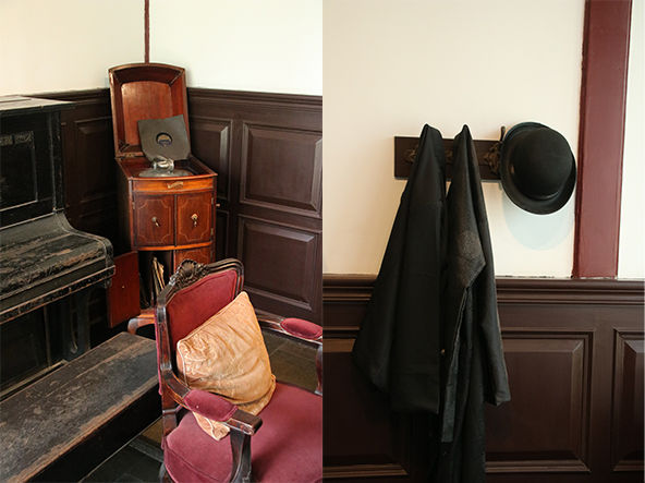 入房左手边是一架当时还很少见的钢琴,墙上是油画,钢琴上摆着古朴考究的西式烛台和棕色花瓶,墙角立着西式唱片机。然而床架、书柜、茶几、座椅都以敦实又稳重的红木打造,和其父亲读书办公的“中书房”风格是一致的。移目至右手边,书桌旁的衣架上挂着一件中式长袍,与一件黑色西装、一顶黑色绅士礼帽相邻,临窗而立的书桌上摆放着典型西式风格的花朵台灯,以及青花瓷瓶子、纸墨笔砚、茶壶,桌子侧边散放着几本蓝色封皮的硬壳笔记本。