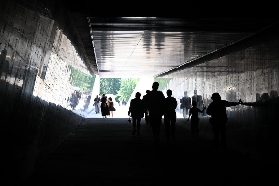 一面镌刻六国文字的“反人类暴行”墙,三千块整齐排列的黑色石碑,一条通往光明的“证言墙”涵洞——随着脚步深入,这些具象符号逐渐浮现。它们无声诉说着那段至暗的记忆,也传递着向往和平的无限希望。