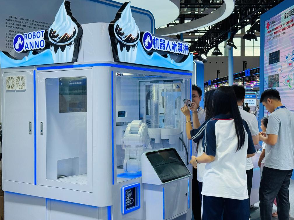 6月28日,安诺机器人(深圳)有限公司冰淇淋机器人吸引消费者体验。新华社记者赵紫羽 摄