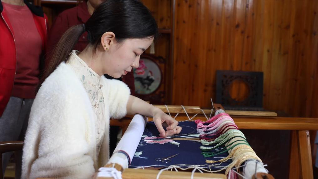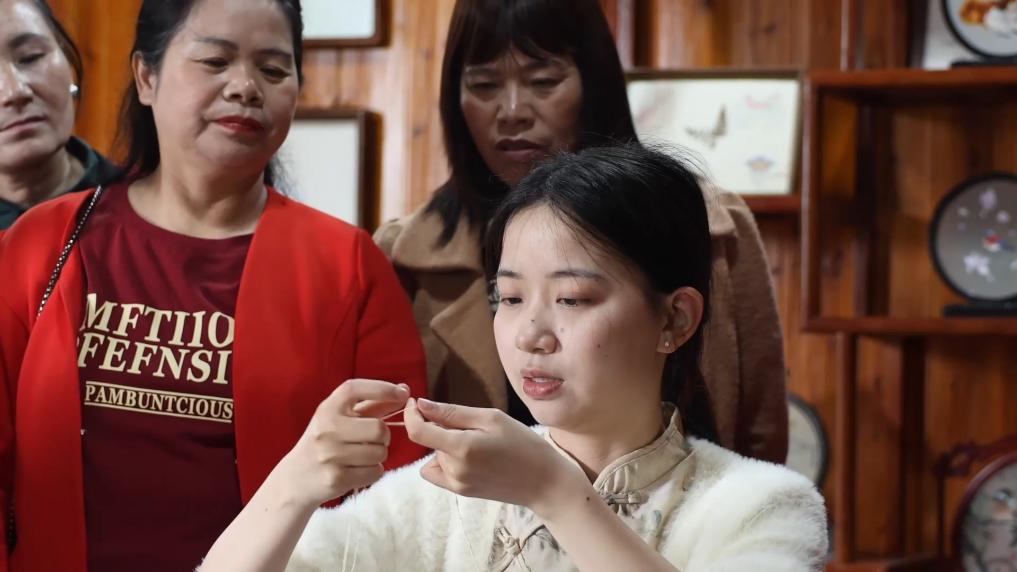 日前,在湖南省桃源县郑家驿镇梨子岗村,1999年出生的肖瑶正领着周边的妇女学习体验桃源刺绣,带动她们在家门口就业,增加收入。