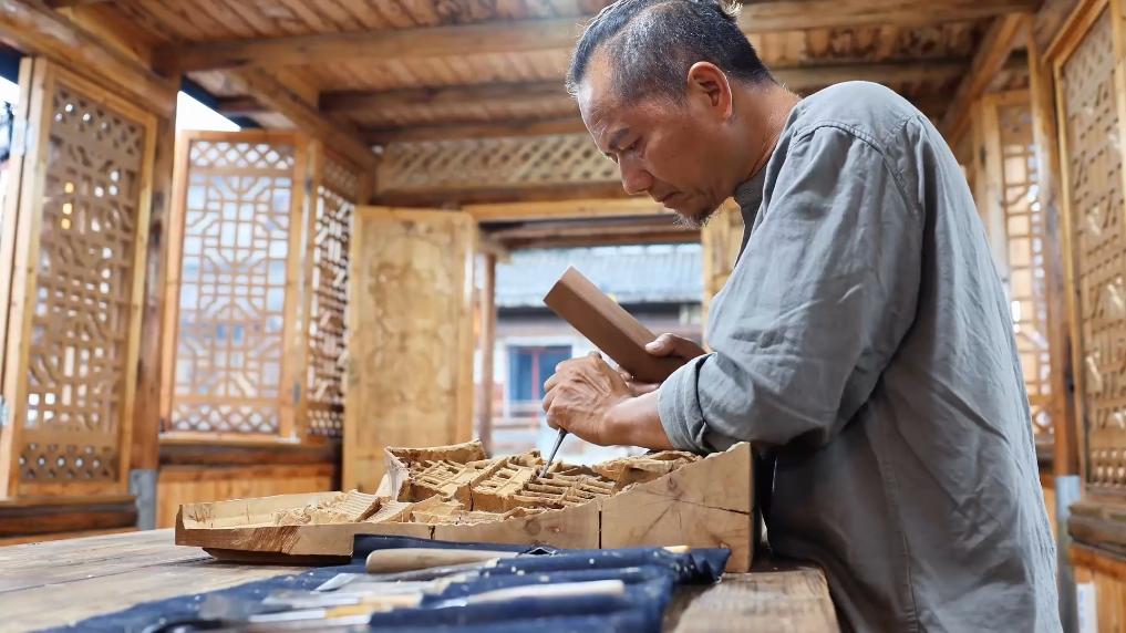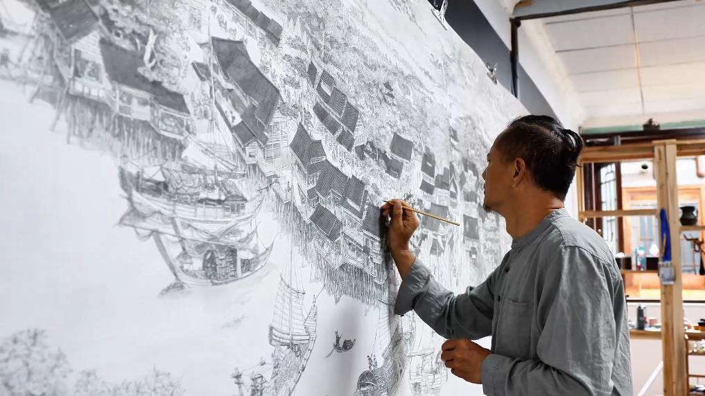 潘能辉以沈从文《湘行散记》为创作蓝本,记录家乡的河流和风土人情,创作展现沅水流域等地风光与人文的巨型木雕。经过5年努力,他即将完成长25米、宽1.5米的水墨画稿。