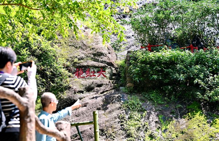 6月25日,游客在福建武夷山风景名胜区参观生长在武夷山九龙窠高岩峭壁上的大红袍茶树母株。