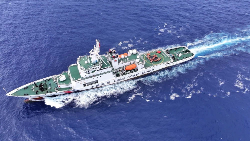 俯瞰中国海警黄岩舰全体党员举行主题党日活动。新华社记者 杨进 摄
