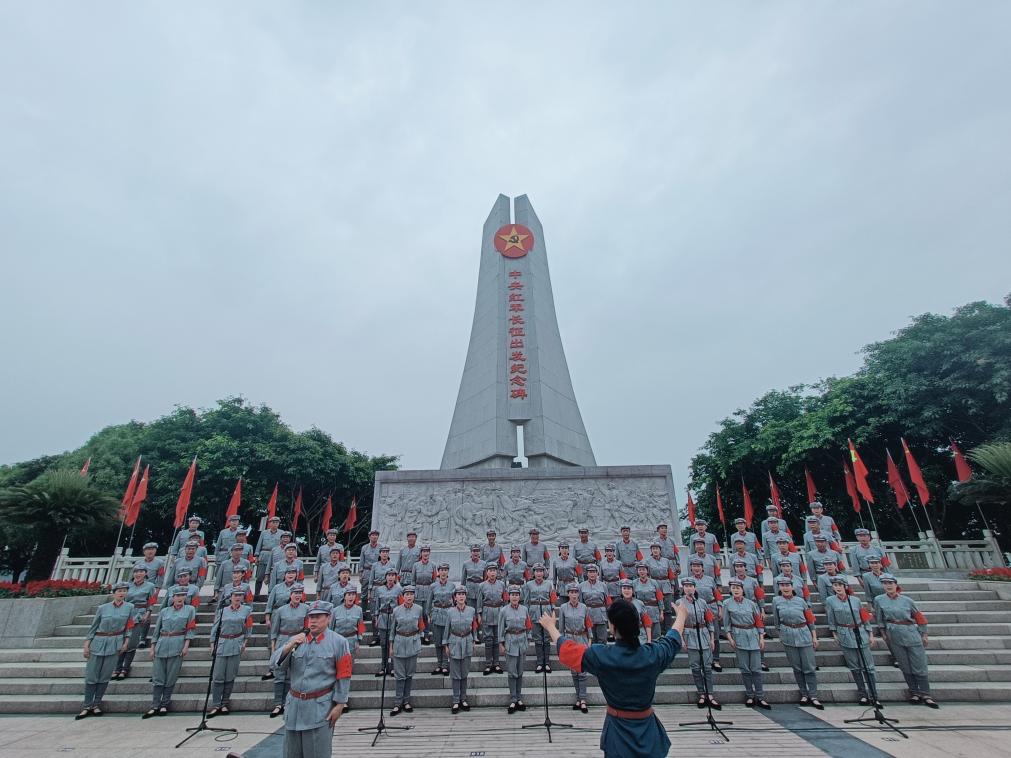 图为于都县长征源合唱团在中央红军长征集结出发纪念碑前演出。新华社发