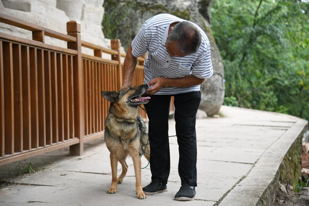 在四川资阳安岳县石羊镇境内的虎头山巅,一位老人经常牵着一条狼狗,在茗山寺外的环形步道转上几圈,仔细检查每一尊摩崖造像是否完好。他,名叫曾祥余,今年76岁。