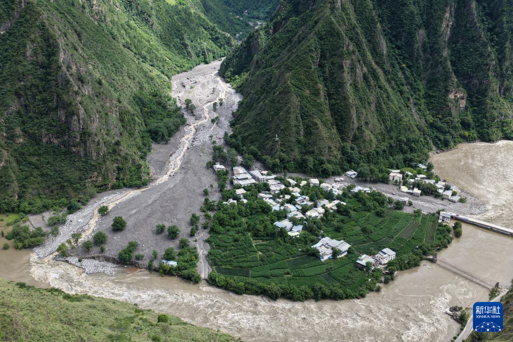 这是7月5日拍摄的四川省甘孜藏族自治州丹巴县巴底镇沈足沟山洪泥石流现场(无人机照片)。新华社发(丹巴县融媒体中心供图)