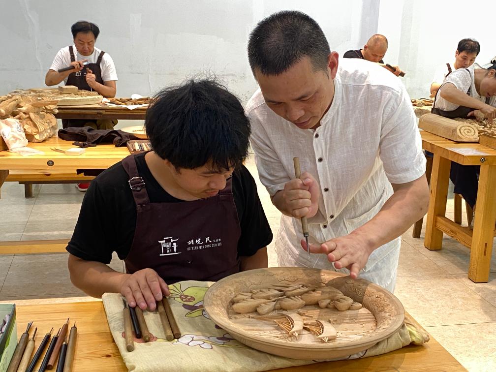胡先民深耕木雕创作近四十载。因亲身经历残障人士的不易,他格外重视残疾人手工艺培训与就业创业扶持。他立足木雕小镇,从木雕技艺拓展至竹木角雕及陶艺等多元研学课程,从校企合作实训到国际赛事锤炼,从单项业务到多元业态,努力为学员铺出一条技能成才的新路。如今,他的学员已站上日、韩、法等国际技能大赛舞台。