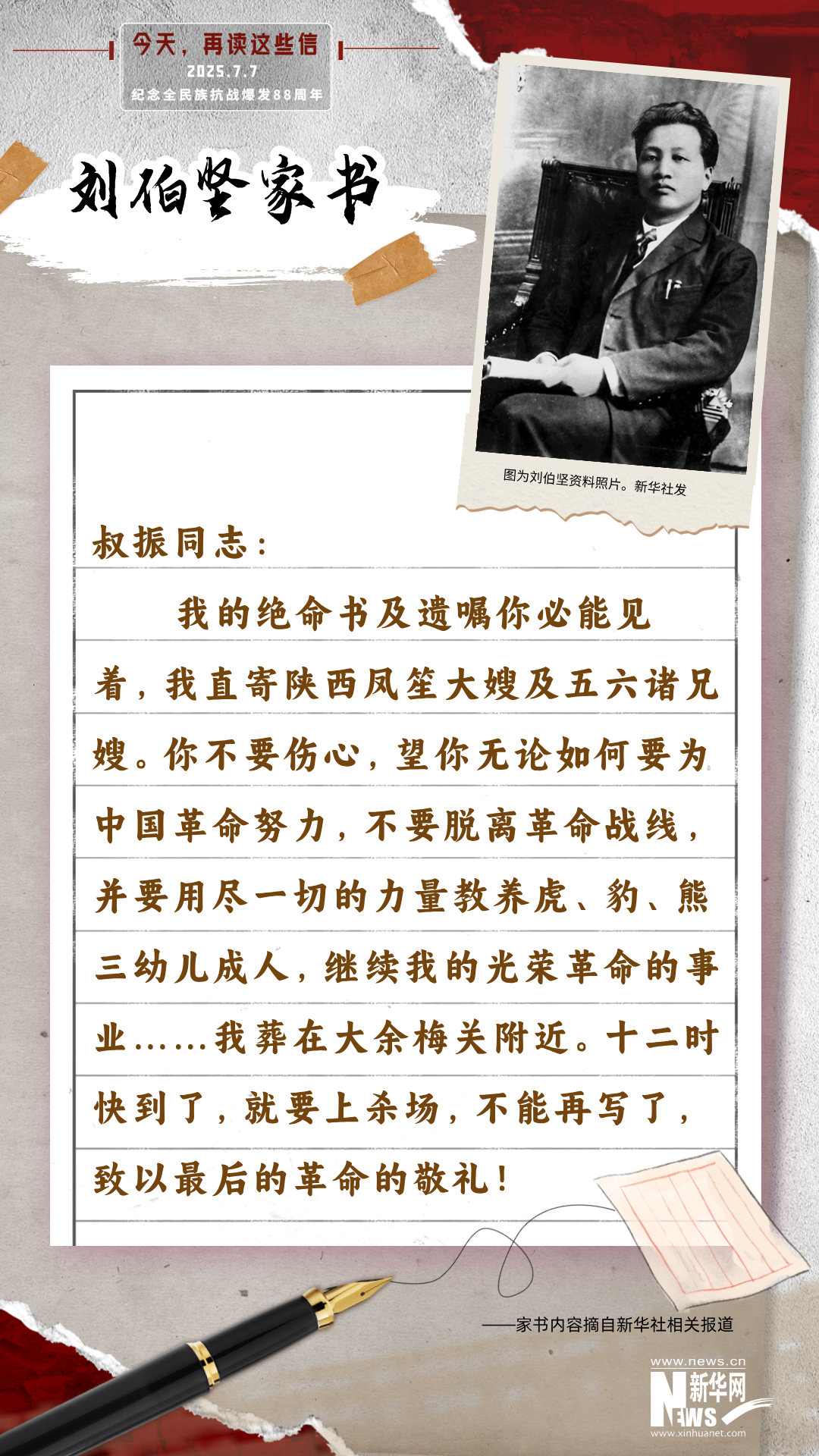 1935年3月21日,刘伯坚牺牲在江西省大余县金莲山刑场,时年40岁。这是刘伯坚英勇就义前写给妻子的最后一封家书。可惜的是,他挚爱的妻子王叔振已牺牲于闽西游击区,没能看到这封家书。