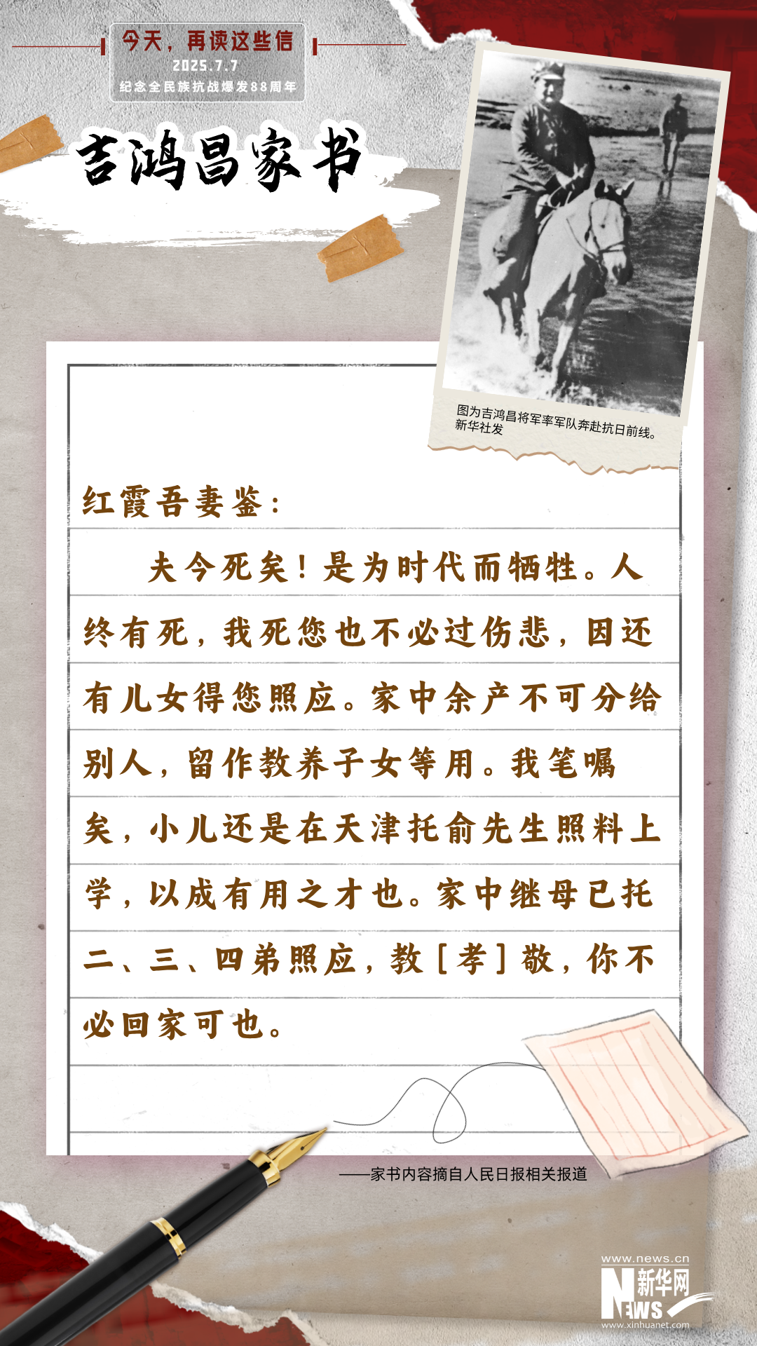 1934年11月24日,在北平陆军监狱,抗日名将吉鸿昌平静地写下家书,嘱咐妻子胡红霞“教养子女”,坚强活下去。之后,从容走上刑场,壮烈牺牲。