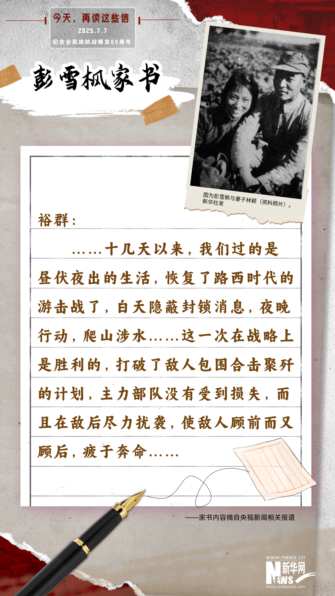 彭雪枫是中国工农红军和新四军杰出指挥员。1944年8月执行中共中央关于向河南敌后进军的指示,指挥所部进行西进战役。9月11日在河南夏邑八里庄指挥作战时牺牲,时年37岁。这是时任新四军第四师师长的彭雪枫,在“三十三天反扫荡”中写给妻子林颖的信。