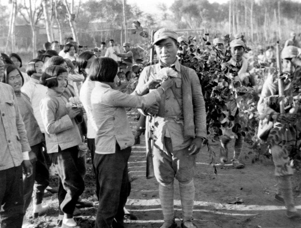 民众为百团大战胜利归来的英雄戴光荣花。新华社发(沙飞 摄)