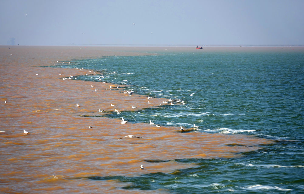 在山东黄河三角洲国家级自然保护区的黄河入海口,黄河水与海水形成颜色对比鲜明的独特景观(2024年10月11日摄)。