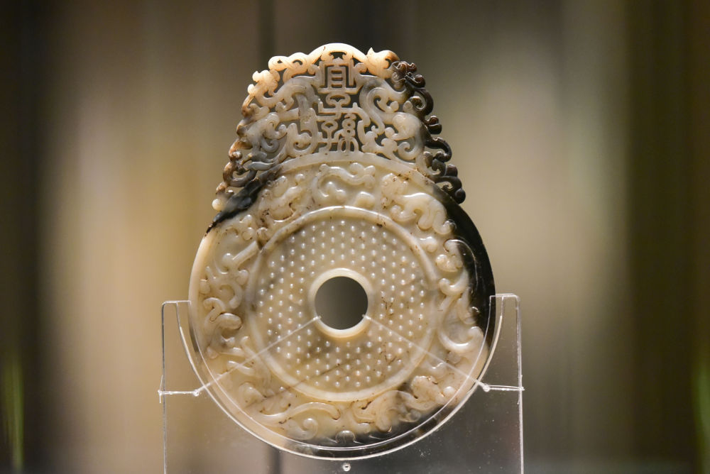 在山东省青州博物馆拍摄的“宜子孙”玉璧(2025年5月13日摄)。