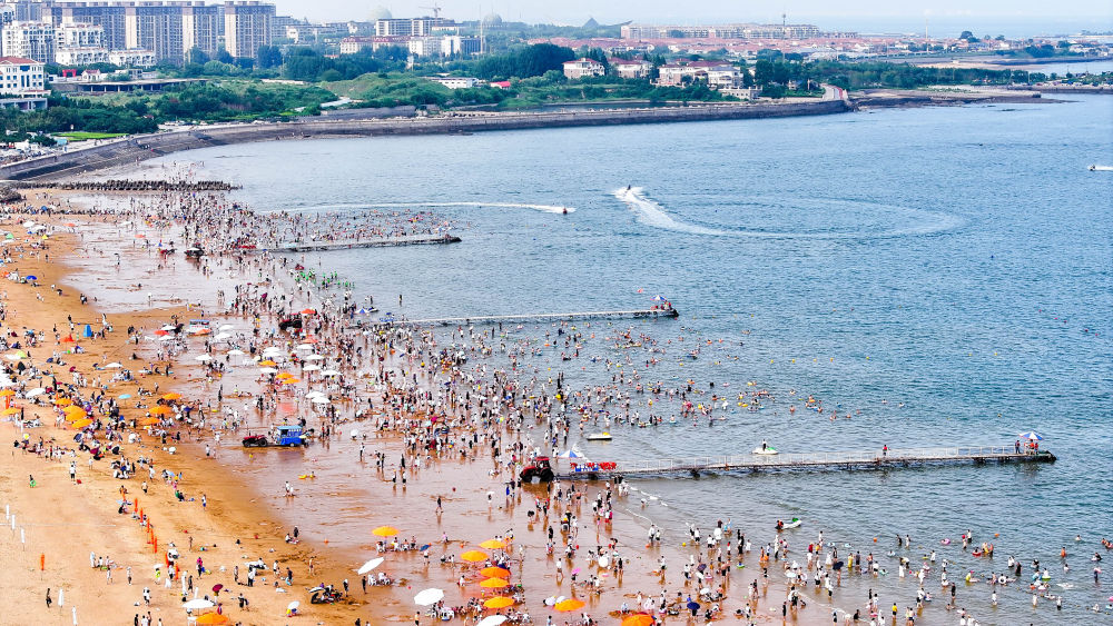 游客在山东省日照市万平口沙滩休闲消夏(2024年8月8日摄)。山东省近年来持续开展海洋生态修复、“蓝色海湾”整治行动,配套建设城市书房、海洋美学馆等文化设施,还市民亲海、休闲空间。