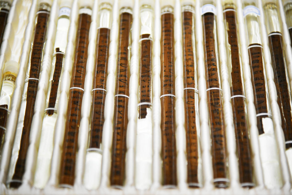 这是在山东博物馆展出的银雀山汉墓出土的《孙子兵法》《孙膑兵法》竹简(2020年4月28日摄)。