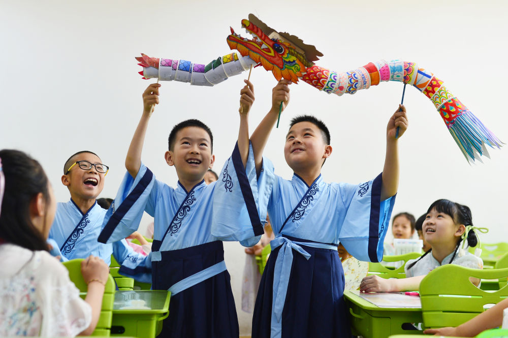 两名学生在山东省青岛市市北区杭州路小学开展的端午文化活动上表演舞龙(2024年6月10日摄)。