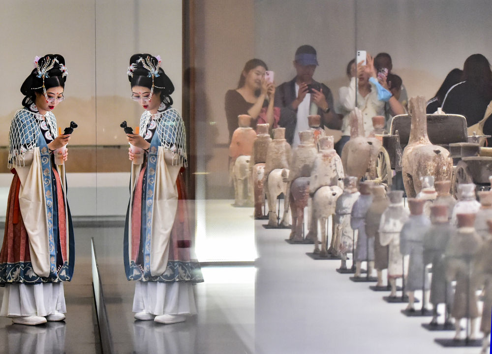 游客在山东省青州博物馆拍摄展出的文物,近距离感受历史和文化的魅力(2025年5月17日摄)。