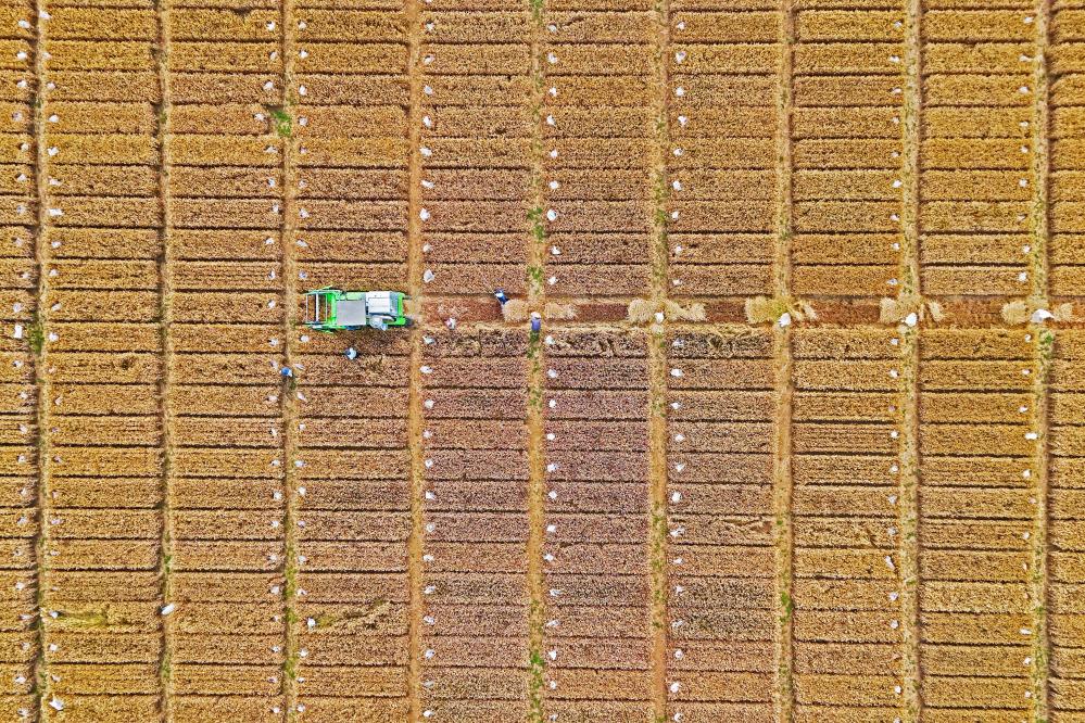 6月18日,收割机在山东省烟台市一处试验田里收割小麦(无人机照片)。新华社发(孙文潭摄)
