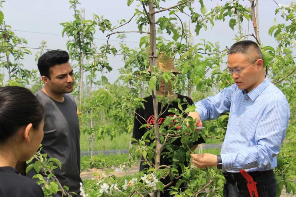 2024年4月,西北农林科技大学教授张东(右)在吉尔吉斯斯坦与当地果农交流苹果种植技术。新华社发
