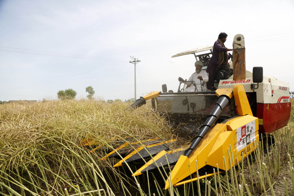 2024年4月17日,在巴基斯坦东部旁遮普省珀格尔地区一处农田,当地农业技术人员操作从中国引进的油菜籽收割机。新华社发(艾哈迈德·卡迈勒摄)