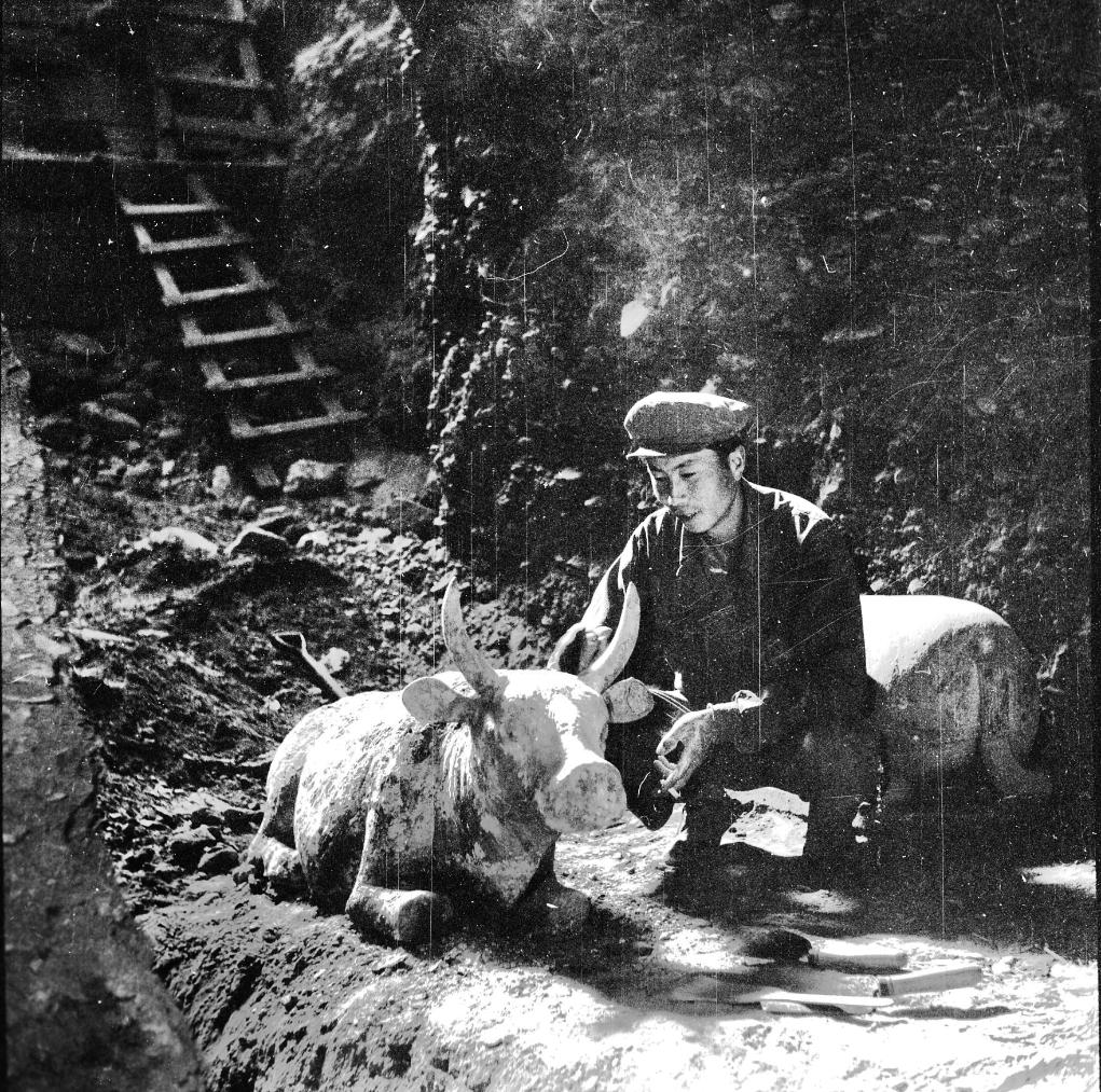 20世纪70年代,工作人员在西夏陵101号陪葬墓中清理出土的鎏金铜牛。新华社发