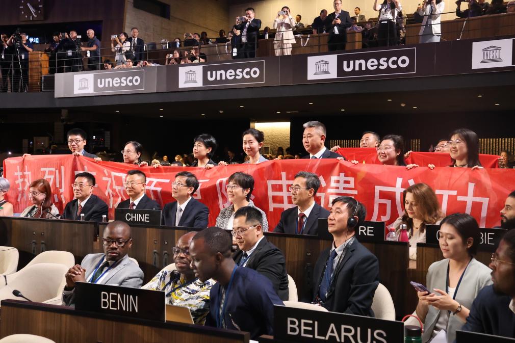 2025年7月11日,在法国巴黎,中方代表团在联合国教科文组织第47届世界遗产大会上庆祝“西夏陵”申遗成功。新华社记者 张百慧 摄