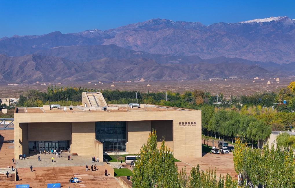 2024年10月10日在宁夏银川拍摄的西夏陵博物馆,远处是西夏帝陵和陵塔。新华社记者 冯开华 摄