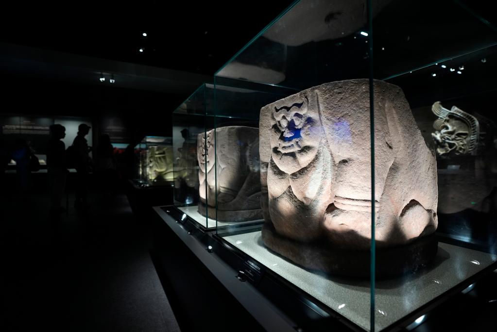 2025年7月9日在西夏陵博物馆拍摄的西夏陵出土文物红砂岩石雕力士志文支座。新华社记者 杨植森 摄