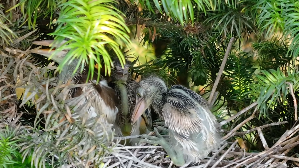 7月6日清晨,经过近二十个昼夜的漫长等待,第一只池鹭宝宝顺利破壳,新生命诞生了!紧接着,是第二只、第三只、第四只。到了7月10日,五只池鹭宝宝全部破壳,巢穴里瞬间变得热闹起来。从池鹭孵化到雏鸟破壳而出,再到亲鸟育雏,整个过程都被观鸟爱好者唐盛利完整地记录了下来。