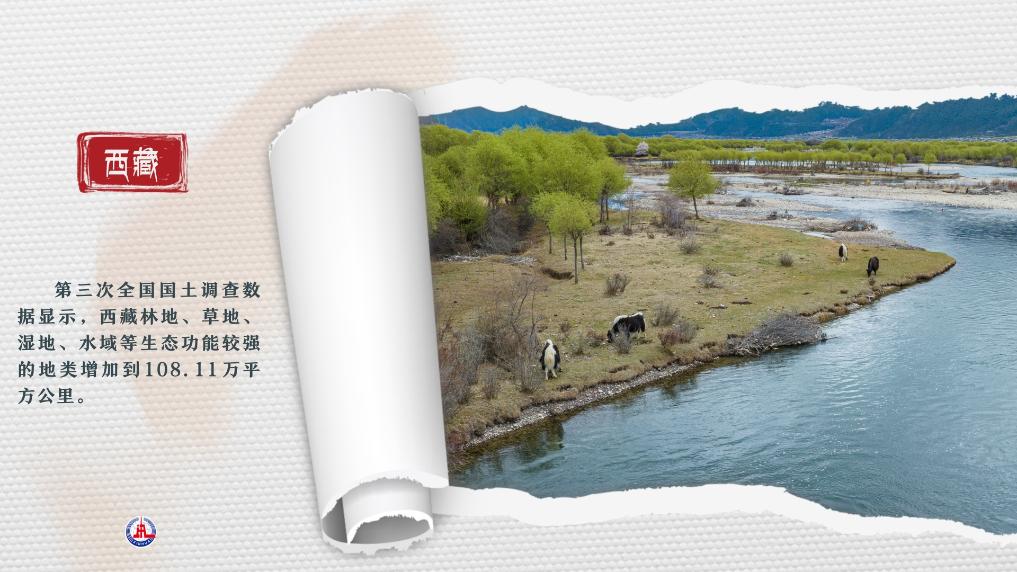 第三次全国国土调查数据显示,西藏林地、草地、湿地、水域等生态功能较强的地类增加到108.11万平方公里。